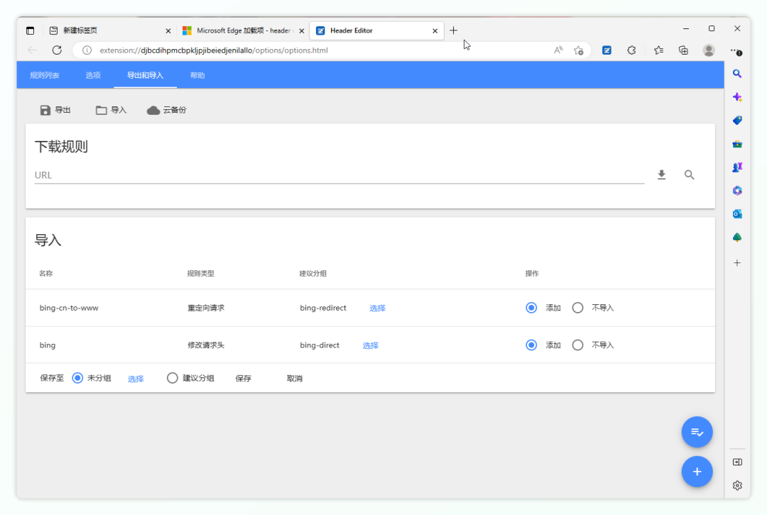 3.打开「Header Editor」的设置 - 导出和导入 - 点击导入 - 选择 json 文件,点击保存。