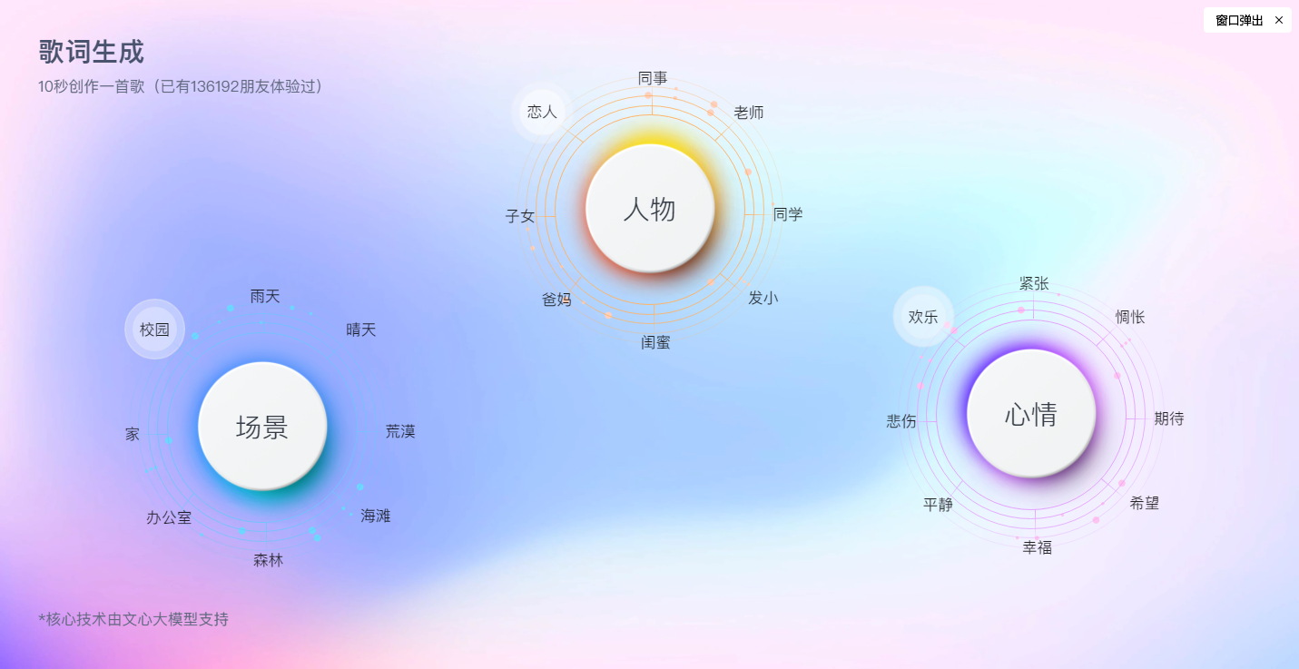 核心技术由文心大模型支持,AI 自动生成歌词网站,网站界面比较简洁、美观。